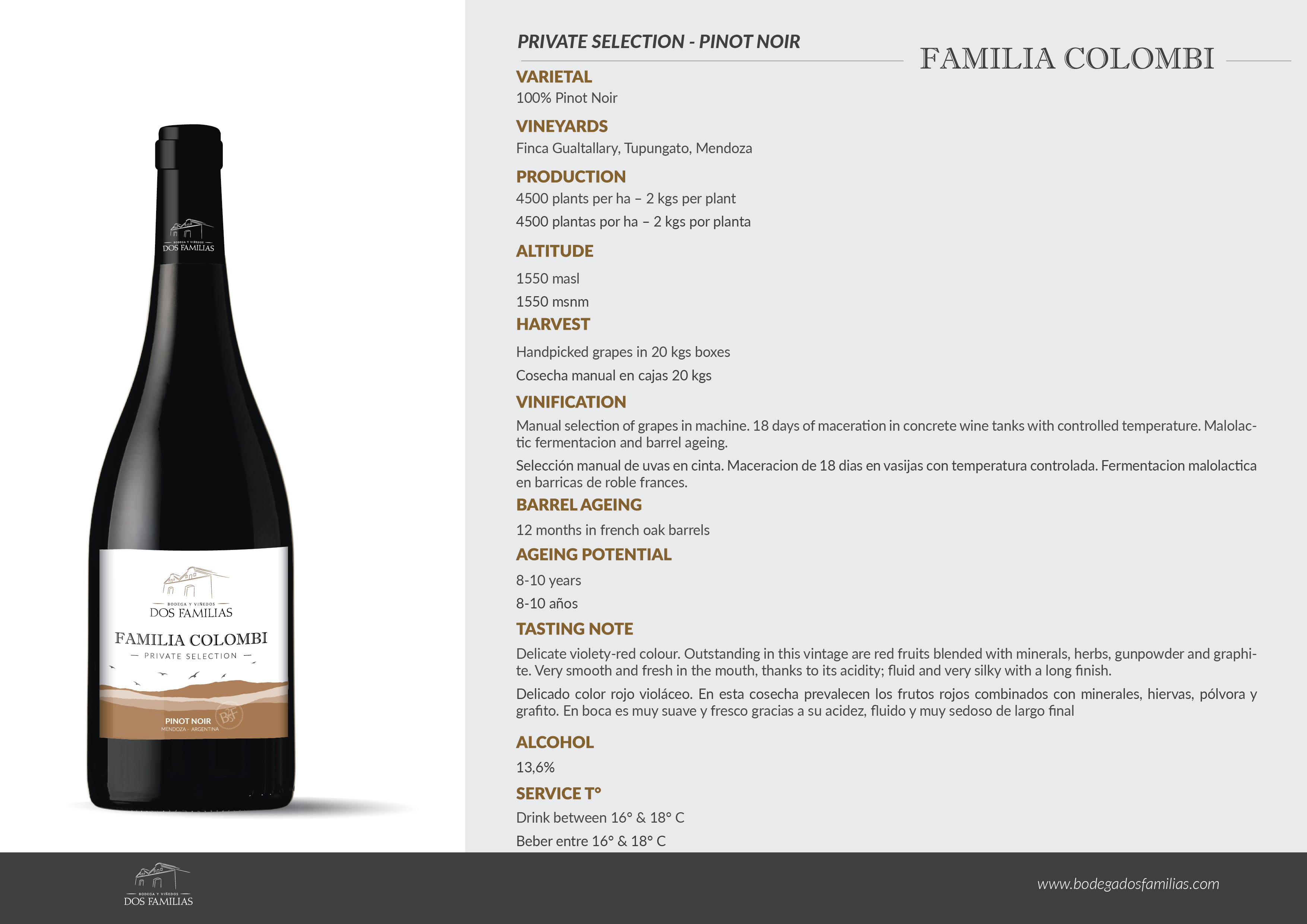 Gualtallary está ubicado a 1.350 msnm, en la zona vitivinícola más elevada de la Provincia de Mendoza, a los pies del volcán Tupungato, una de las cumbres más altas de los Andes. Esta zona se caracteriza por su combinación de altura, suelos aluviales, días soleados, poca lluvia y gran amplitud térmica. La combinación de clima fresco y suelos calcáreos, nos brinda vinos Pinot Noir con gran estructura y rica acidez. De “Finca La Cautiva” es donde sacamos las uvas Pinot Noir para nuestras líneas Familia Colombi Selección de Familia y Familia Colombi Gran Reserva.